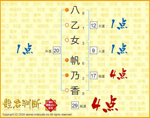 八乙女帆乃香さんの総運は29画の4点!