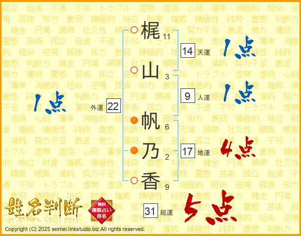 梶(11画)山(3画) 帆(6画)乃(2画)香(9画)