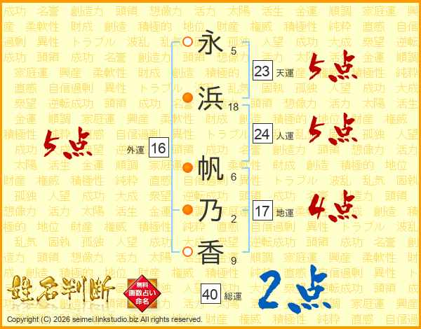 永(5画)浜(18画) 帆(6画)乃(2画)香(9画)