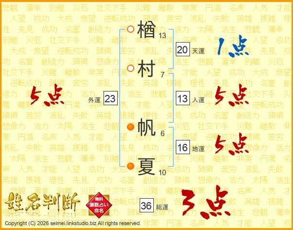 楢(13画)村(7画) 帆(6画)夏(10画)