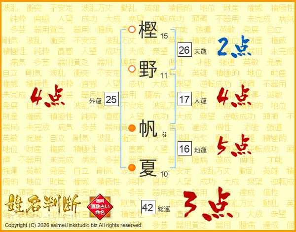 樫(15画)野(11画) 帆(6画)夏(10画)