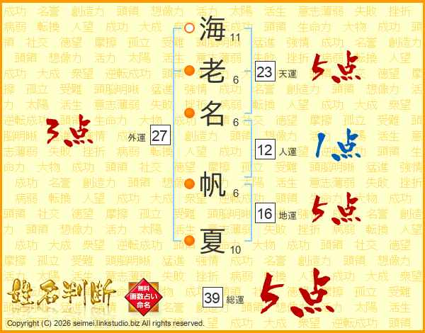 海(11画)老(6画)名(6画) 帆(6画)夏(10画)