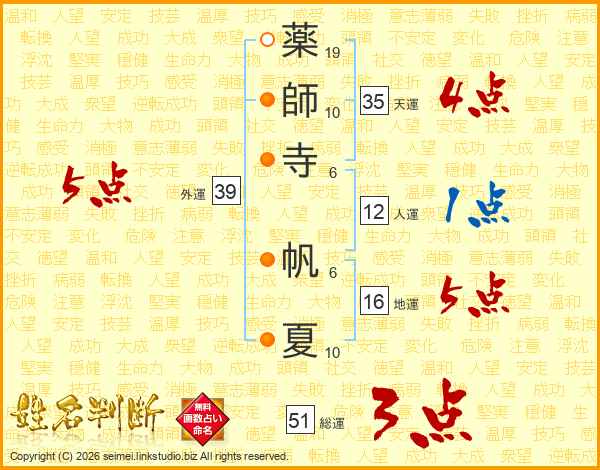 薬(19画)師(10画)寺(6画) 帆(6画)夏(10画)