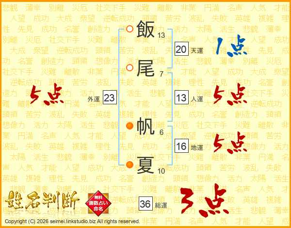 飯(13画)尾(7画) 帆(6画)夏(10画)