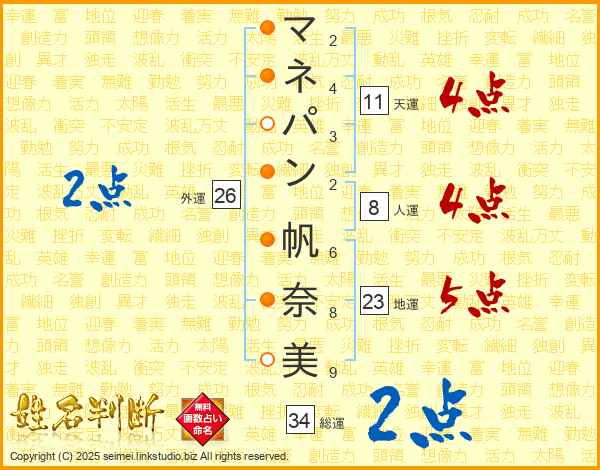 マ(2画)ネ(4画)パ(3画)ン(2画) 帆(6画)奈(8画)美(9画)
