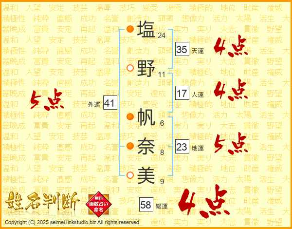 塩(24画)野(11画) 帆(6画)奈(8画)美(9画)