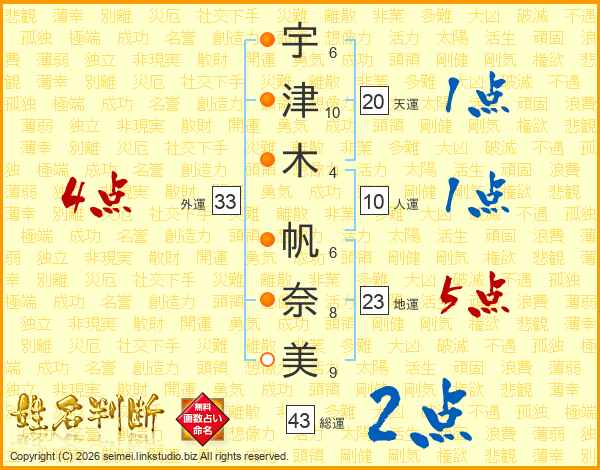宇(6画)津(10画)木(4画) 帆(6画)奈(8画)美(9画)