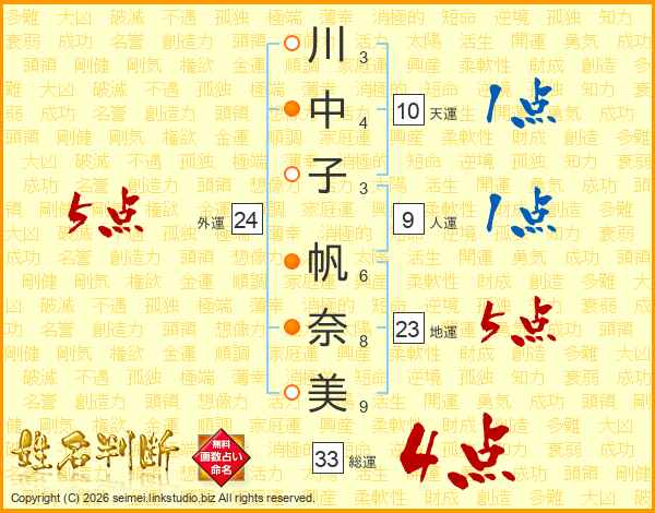 川(3画)中(4画)子(3画) 帆(6画)奈(8画)美(9画)