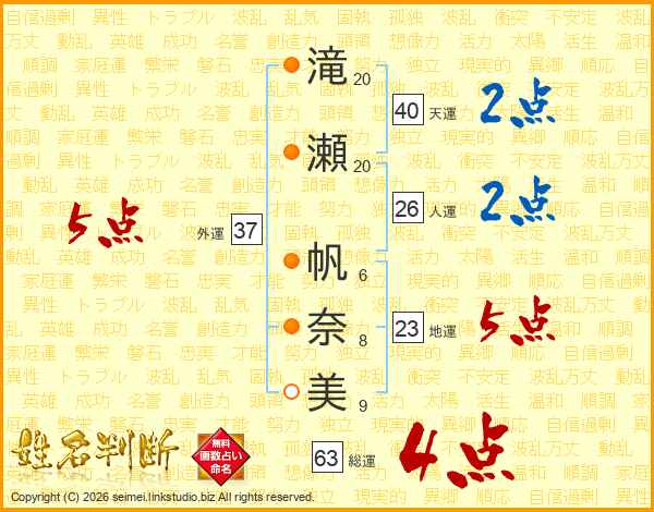 滝瀬帆奈美さんの総運は63画の4点!
