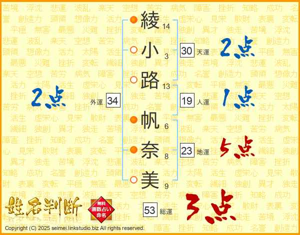 綾(14画)小(3画)路(13画) 帆(6画)奈(8画)美(9画)