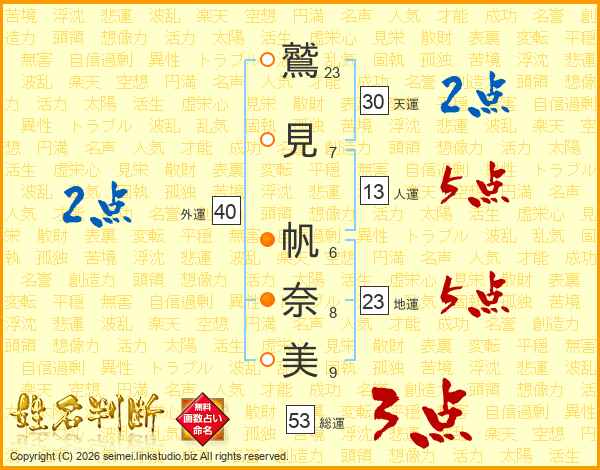 鷲(23画)見(7画) 帆(6画)奈(8画)美(9画)