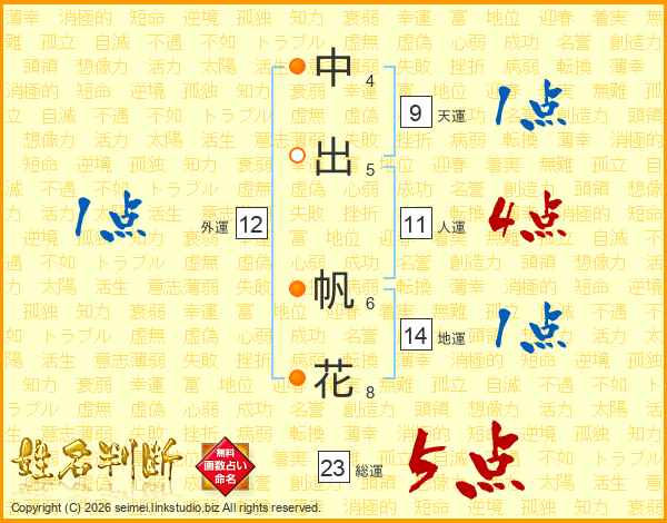 生活面を象徴する運勢です。外部から受ける影響力を表し、結婚運、家庭運や職場、環境への順応性を表します。総運から人運を引いた画数。姓や名が1文字の場合を除く。