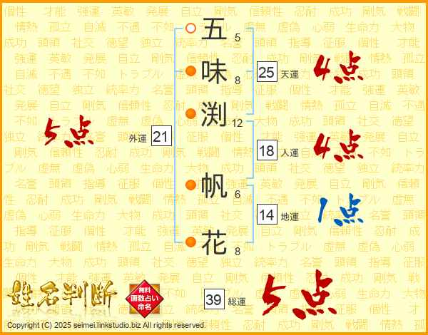 五味渕帆花さんの外運は21画の5点!