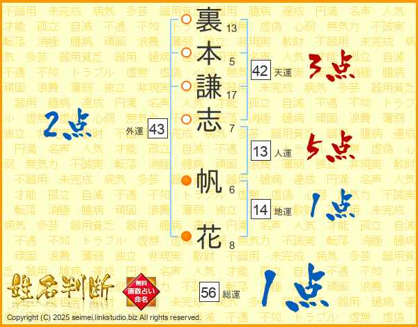 裏(13画)本(5画)謙(17画)志(7画) 帆(6画)花(8画)