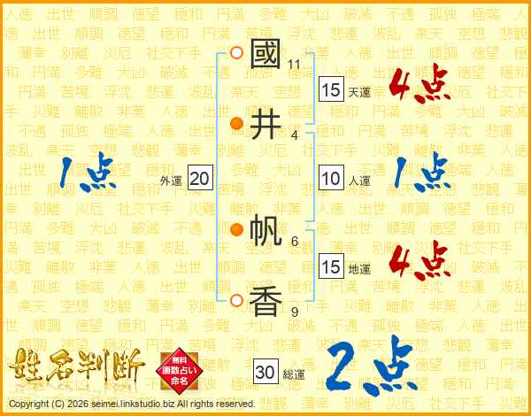 生活面を象徴する運勢です。外部から受ける影響力を表し、結婚運、家庭運や職場、環境への順応性を表します。総運から人運を引いた画数。姓や名が1文字の場合を除く。