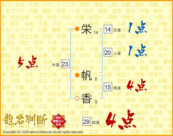 生活面を象徴する運勢です。外部から受ける影響力を表し、結婚運、家庭運や職場、環境への順応性を表します。総運から人運を引いた画数。姓や名が1文字の場合を除く。