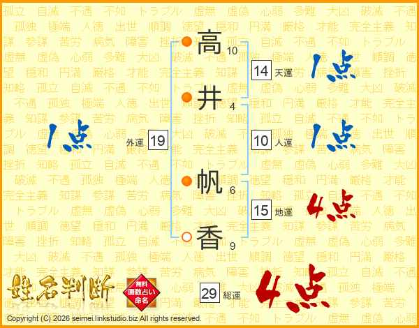 生活面を象徴する運勢です。外部から受ける影響力を表し、結婚運、家庭運や職場、環境への順応性を表します。総運から人運を引いた画数。姓や名が1文字の場合を除く。