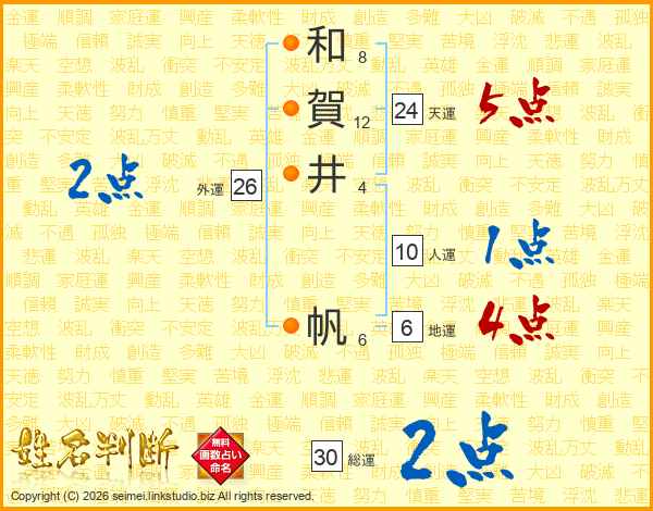 和(8画)賀(12画)井(4画) 帆(6画)