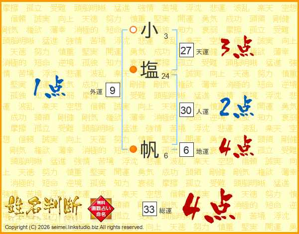 小塩帆さんの総運は33画の4点!