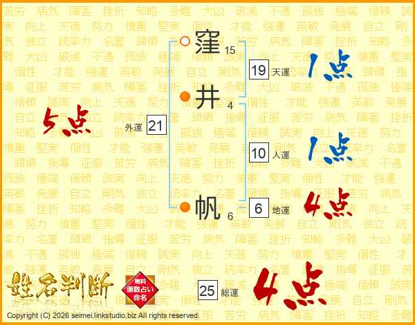 生活面を象徴する運勢です。外部から受ける影響力を表し、結婚運、家庭運や職場、環境への順応性を表します。総運から人運を引いた画数。姓や名が1文字の場合を除く。