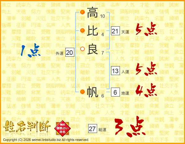 生活面を象徴する運勢です。外部から受ける影響力を表し、結婚運、家庭運や職場、環境への順応性を表します。総運から人運を引いた画数。姓や名が1文字の場合を除く。
