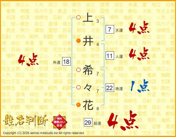 上井希々花さんの総運は29画の4点!