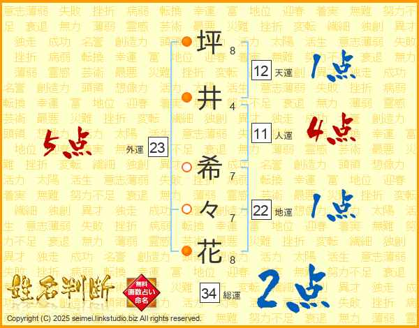 坪(8画)井(4画) 希(7画)々(7画)花(8画)