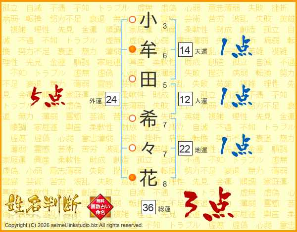 小(3画)牟(6画)田(5画) 希(7画)々(7画)花(8画)