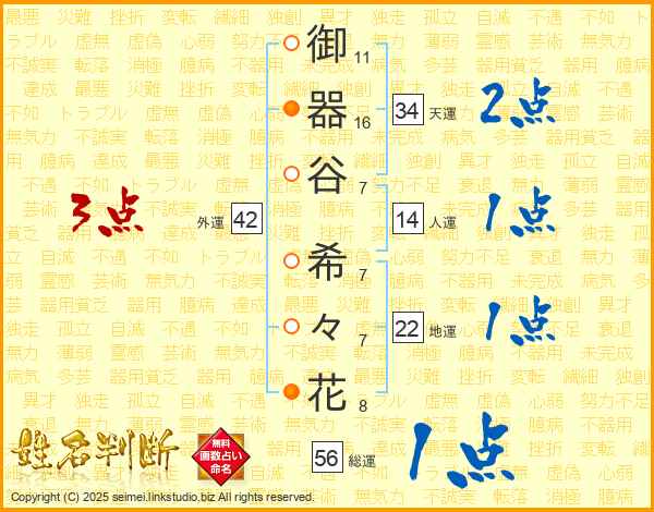 御(11画)器(16画)谷(7画) 希(7画)々(7画)花(8画)
