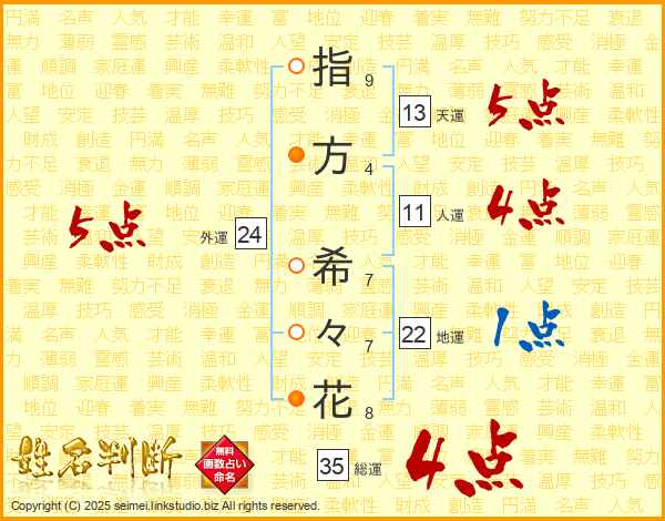 指(9画)方(4画) 希(7画)々(7画)花(8画)