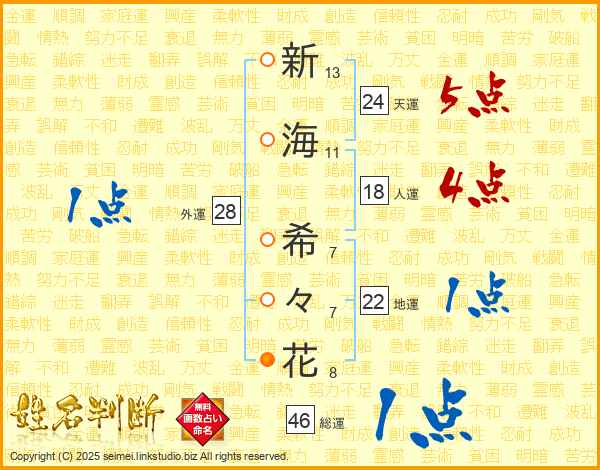 新(13画)海(11画) 希(7画)々(7画)花(8画)