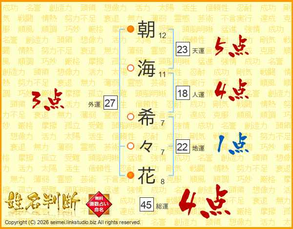 朝(12画)海(11画) 希(7画)々(7画)花(8画)