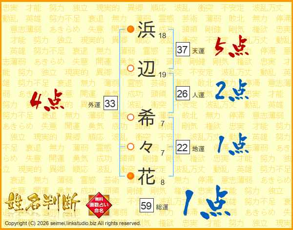 浜(18画)辺(19画) 希(7画)々(7画)花(8画)