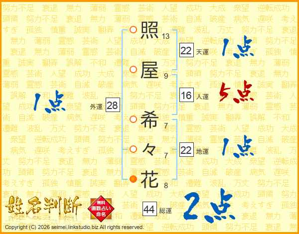 照(13画)屋(9画) 希(7画)々(7画)花(8画)