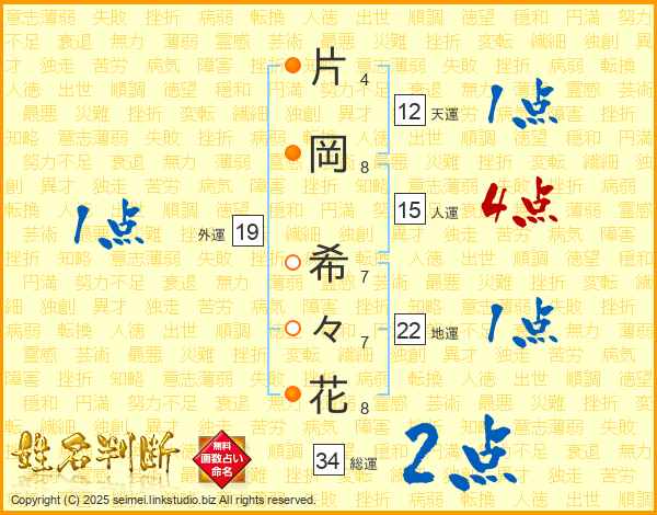 片(4画)岡(8画) 希(7画)々(7画)花(8画)