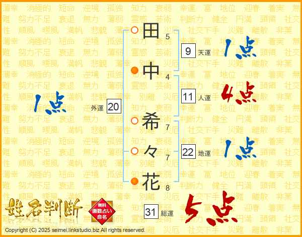 田(5画)中(4画) 希(7画)々(7画)花(8画)