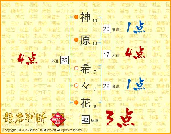 神(10画)原(10画) 希(7画)々(7画)花(8画)