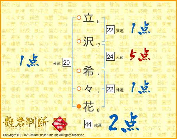 立(5画)沢(17画) 希(7画)々(7画)花(8画)