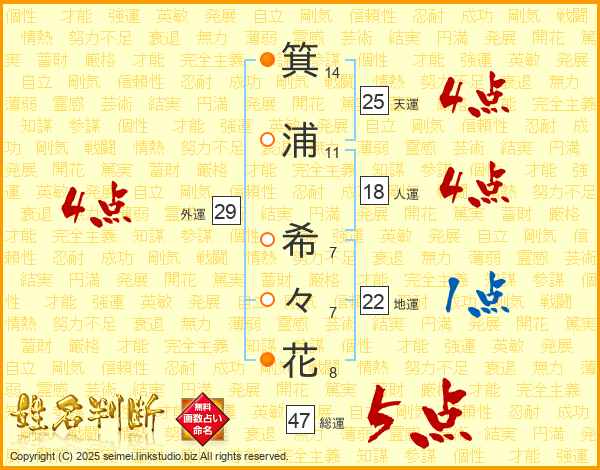 箕(14画)浦(11画) 希(7画)々(7画)花(8画)