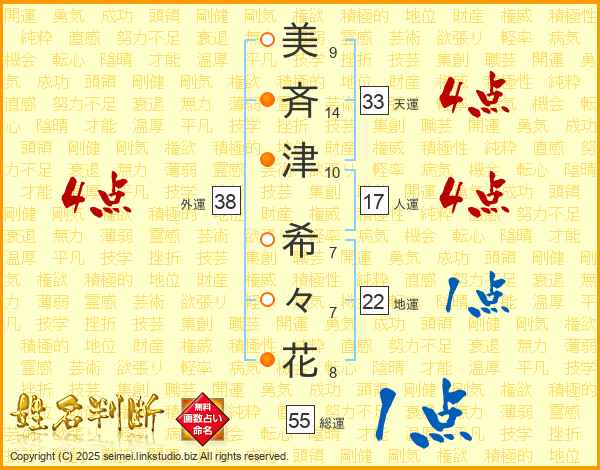 美(9画)斉(14画)津(10画) 希(7画)々(7画)花(8画)