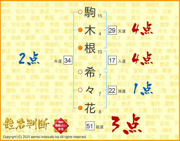 駒(15画)木(4画)根(10画) 希(7画)々(7画)花(8画)