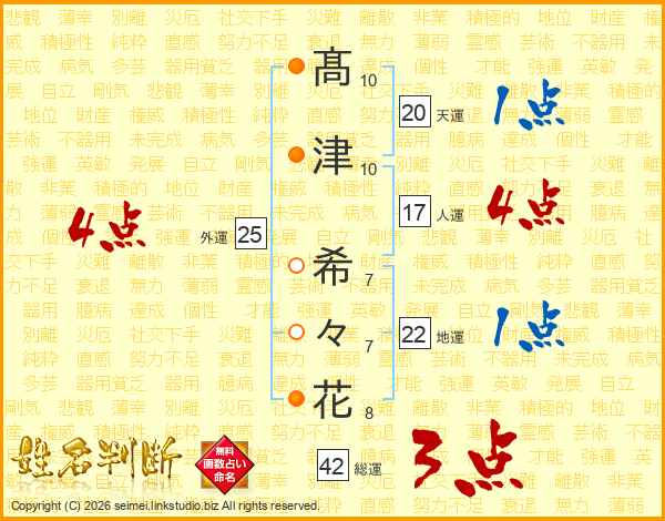 髙(10画)津(10画) 希(7画)々(7画)花(8画)