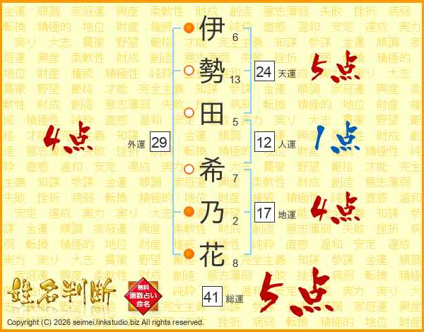 伊(6画)勢(13画)田(5画) 希(7画)乃(2画)花(8画)