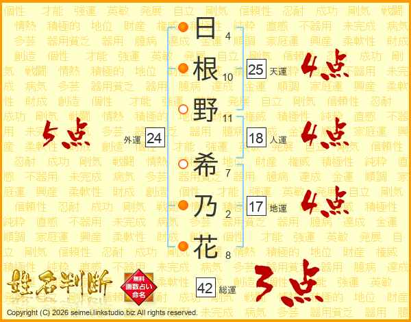 日(4画)根(10画)野(11画) 希(7画)乃(2画)花(8画)