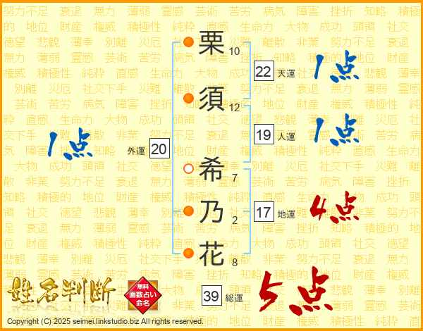 栗須希乃花さんの総運は39画の5点!