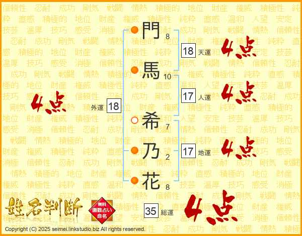 門馬希乃花さんの外運は18画の4点!