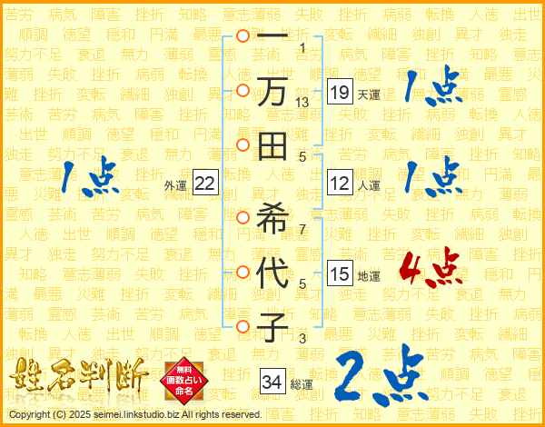 一(1画)万(13画)田(5画) 希(7画)代(5画)子(3画)