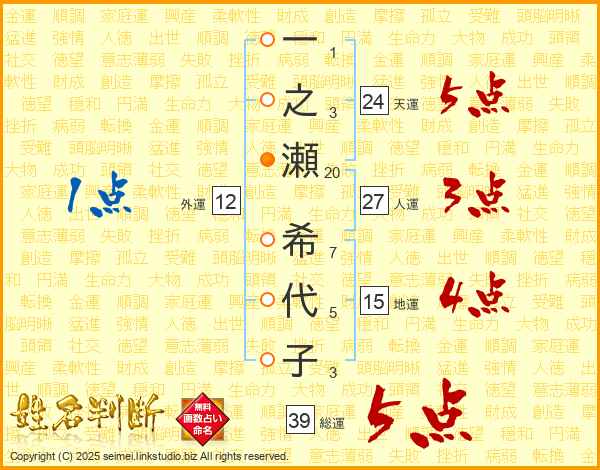 一(1画)之(3画)瀬(20画) 希(7画)代(5画)子(3画)