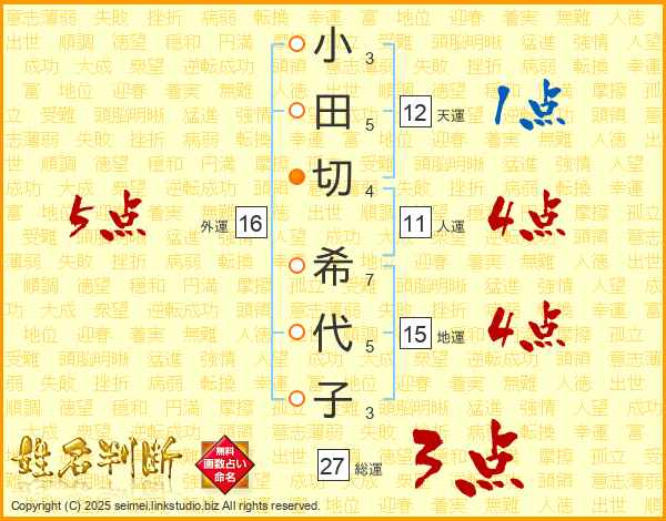 小(3画)田(5画)切(4画) 希(7画)代(5画)子(3画)