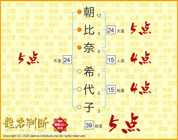 朝(12画)比(4画)奈(8画) 希(7画)代(5画)子(3画)